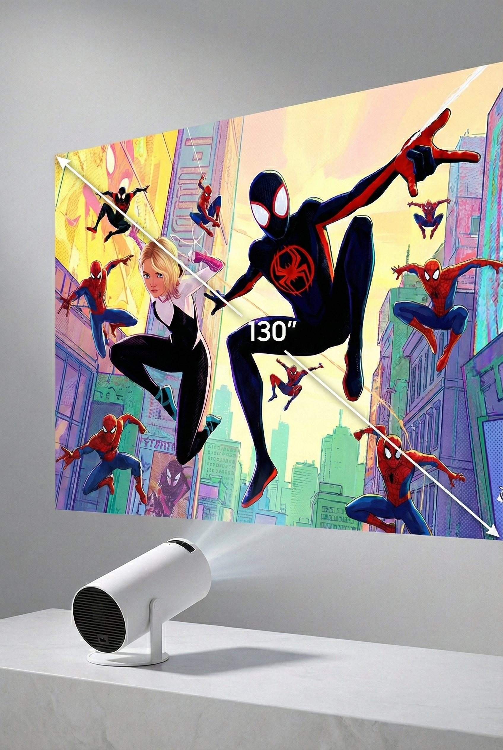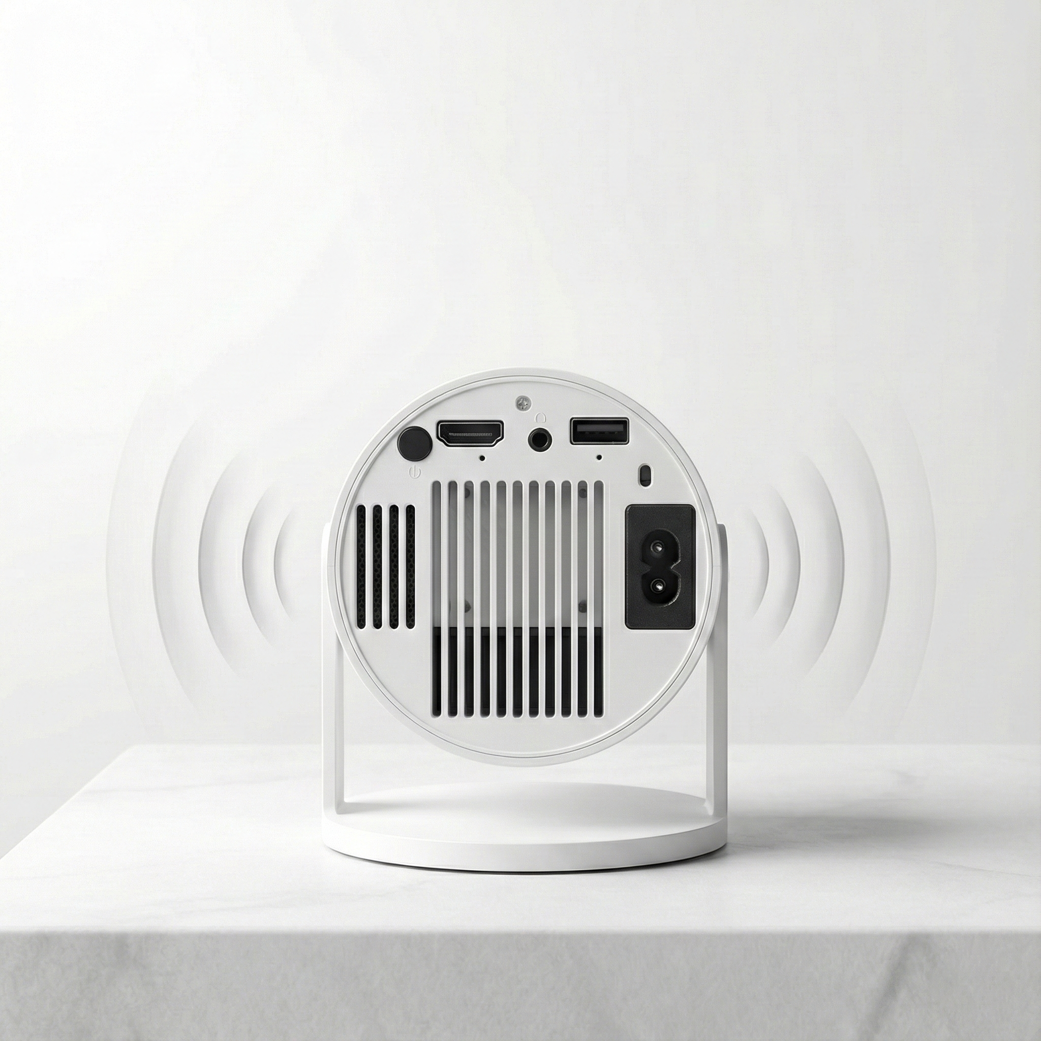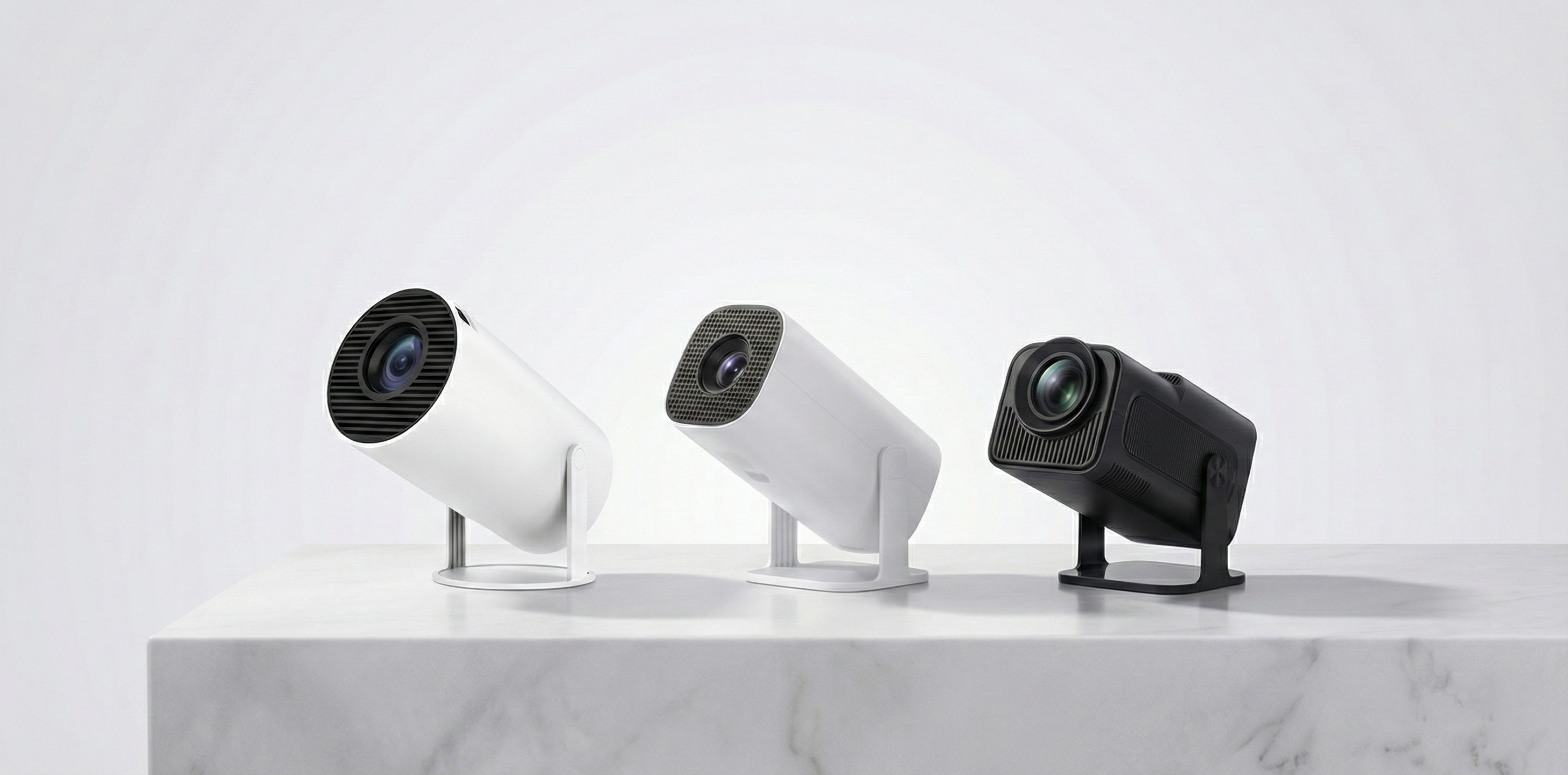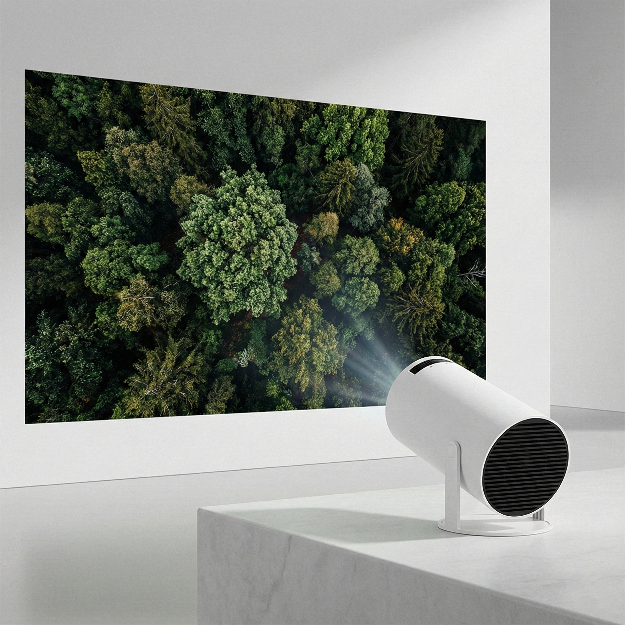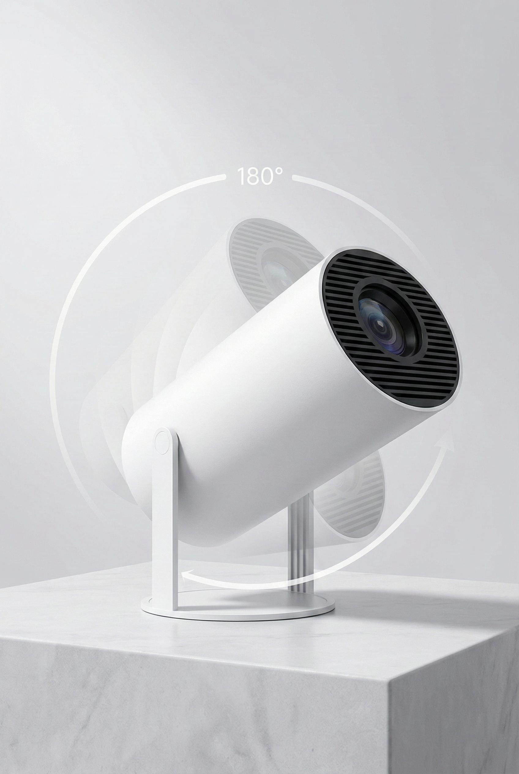 Kompaktiškas, nešiojamas projektorius su automatine korekcija ir HD raiška, įmontuota Android TV 11.0 sistema, užtikrinantis puikią vaizdo kokybę namų kino vakarams.